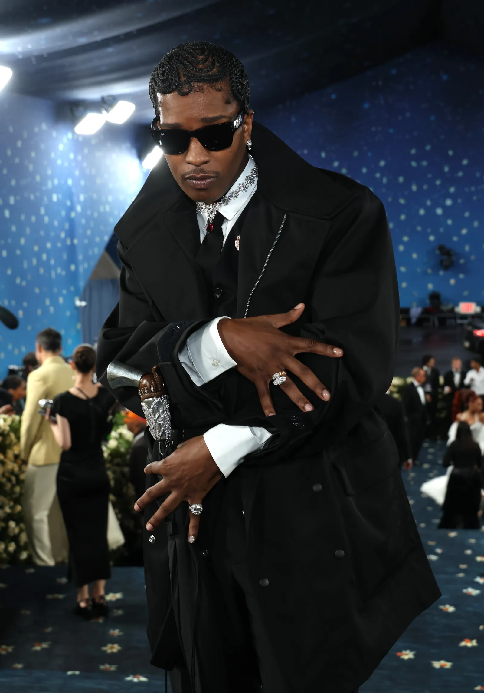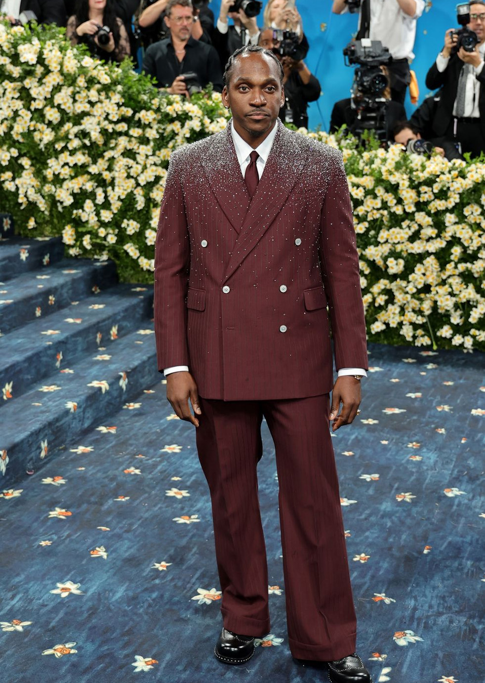 El rapero y coanfitrión de la gala nos deslumbro eligiendo un diseño personalizado de su propia agencia creativa AWGE, con un look memorable y representando un dandy moderno, complementando este original traje van de la mano unos zapatos Oxford que AWGE creó en colaboración con Christian Louboutin, junto con piezas de joyería de Bvlgari.